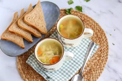 Snijd alle groenten heel fijn. Doe de helft van de ui, prei en wortel in een pan samen met het water, de kipfilets, laurierblaadje, stukje foelie en verse peterselie. Breng de soep aan de kook en laat circa een uur pruttelen.